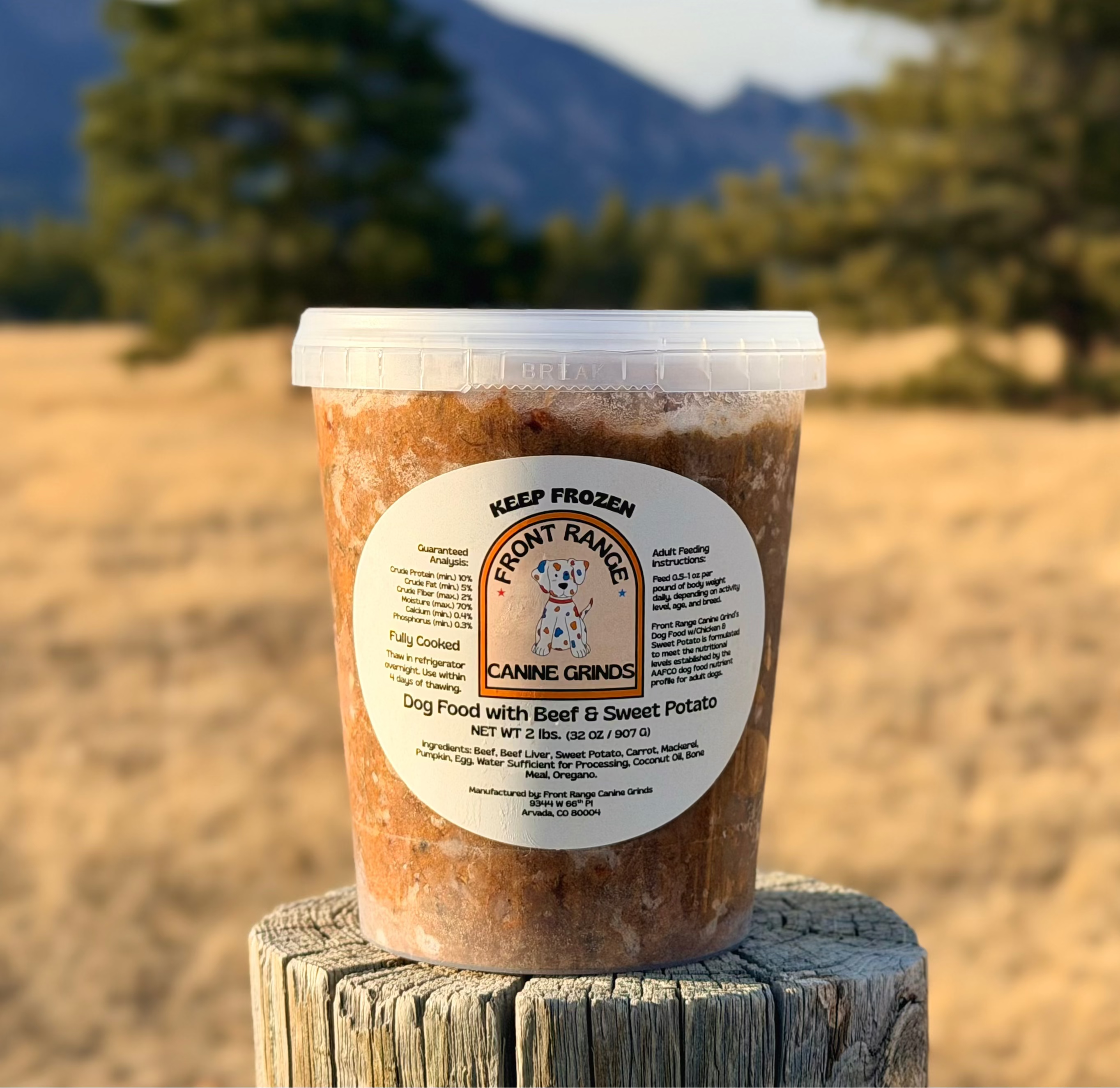 Quality dog food handcrafted in Arvada, Colorado. Each grind is a fully cooked blend of high quality ingredients, formulated for optimum protein, fat, carbs/fiber, and essential nutrients+minerals. Always under $5/lb.